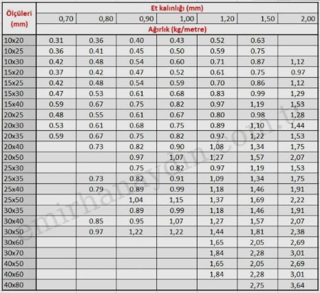 KUTU PROFİL İÇİN EN KOLAY AĞIRLIK TABLOSU..